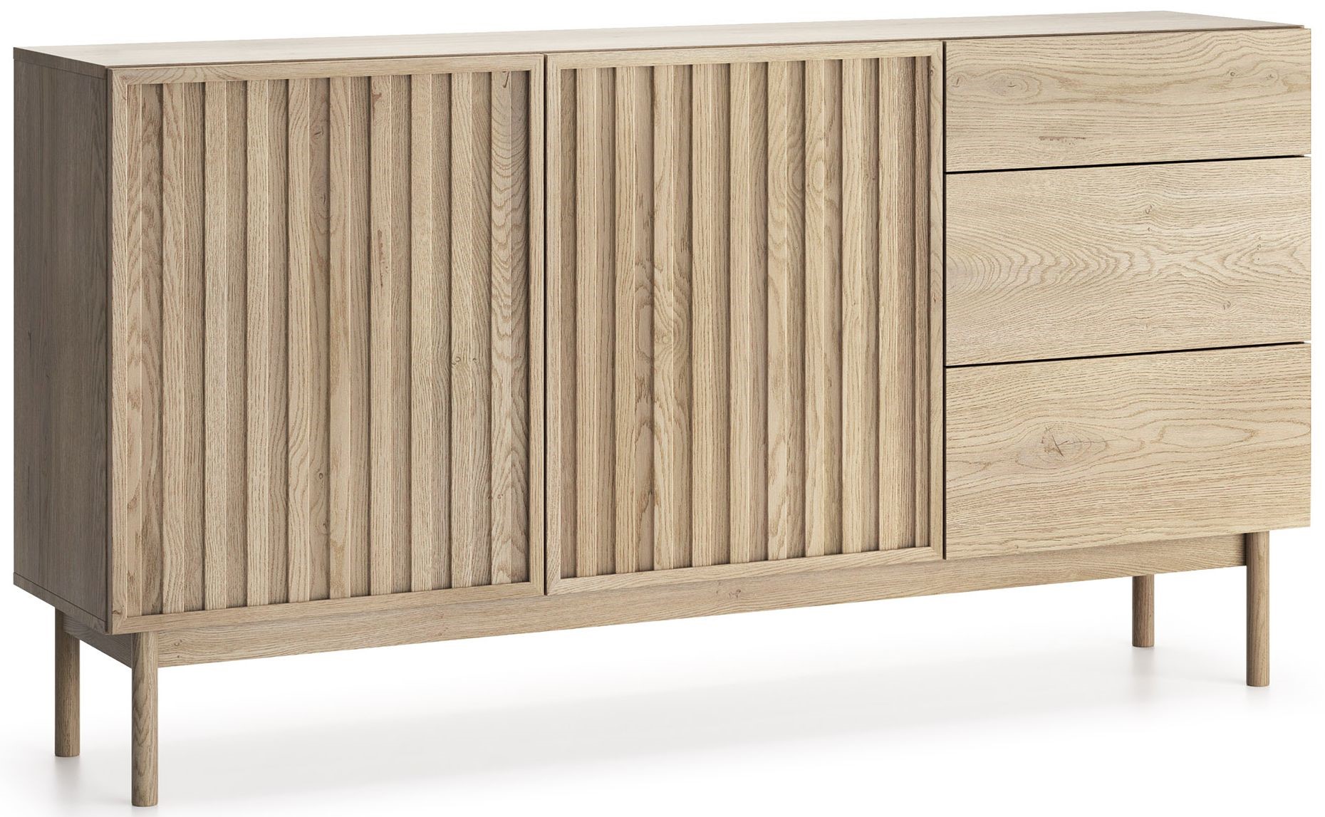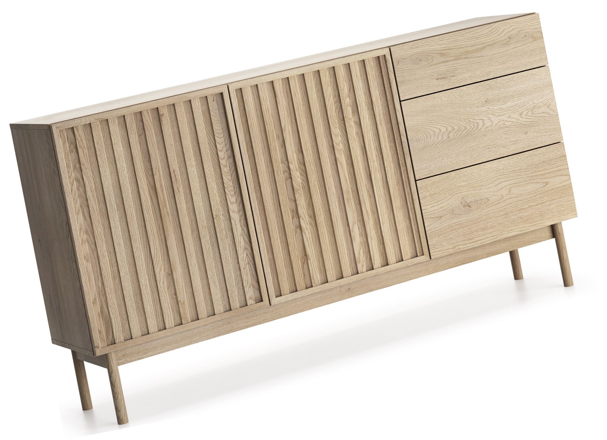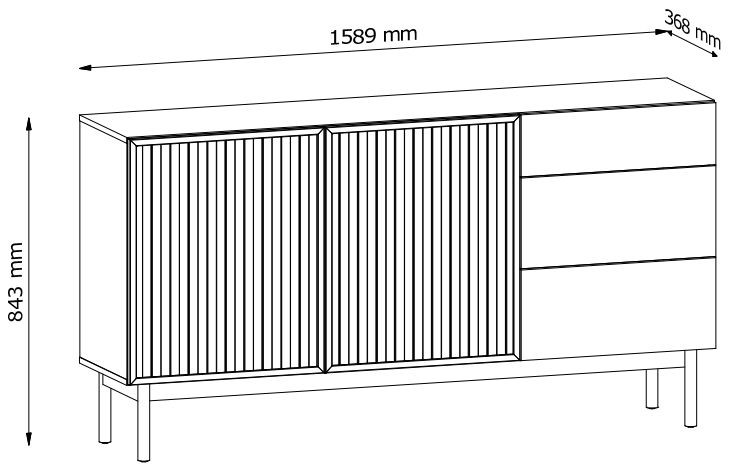 Bezuchwytowy system z trójwymiarowym efektem dzięki ryflowanym frontom. Pakowne szuflady i szafka na odzież lub dokumenty. Wysokie drewniane nóżki z dodatkowym wspornikiem zapewniają stabilność i zmniejszają ryzyko niepotrzebnych ruchów, dodatkowo pozwolą dotrzeć robotom sprzątającym w każdy zakamarek .
