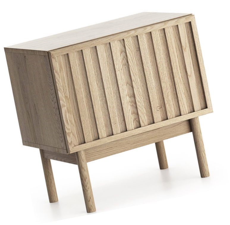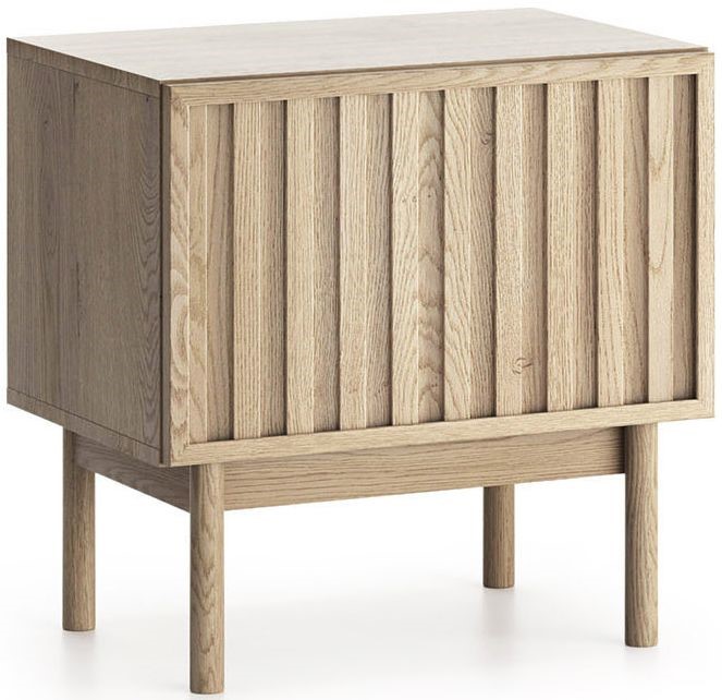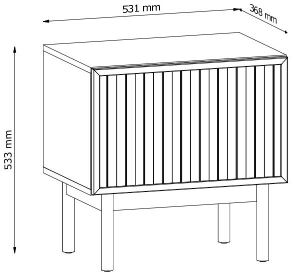 Bezuchwytowy system z trójwymiarowym efektem dzięki ryflowanym frontom. Pakowne szuflady i szafka na odzież lub dokumenty. Wysokie drewniane nóżki z dodatkowym wspornikiem zapewniają stabilność i zmniejszają ryzyko niepotrzebnych ruchów, dodatkowo pozwolą dotrzeć robotom sprzątającym w każdy zakamarek .