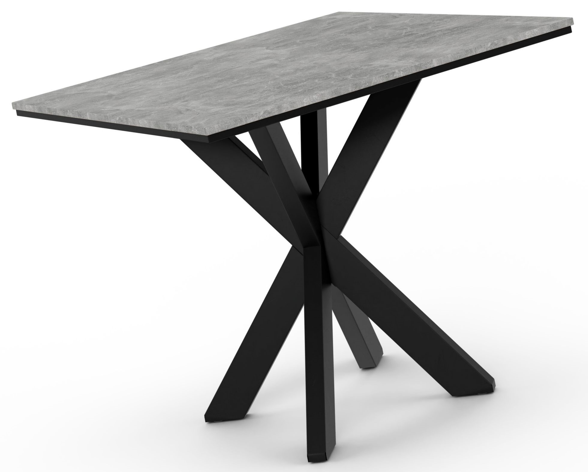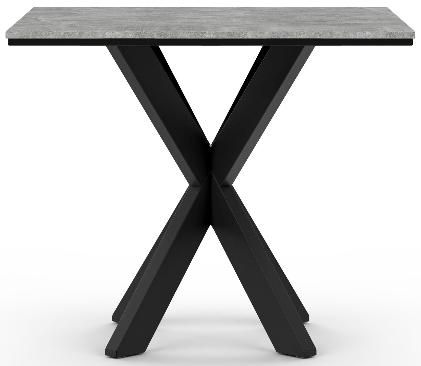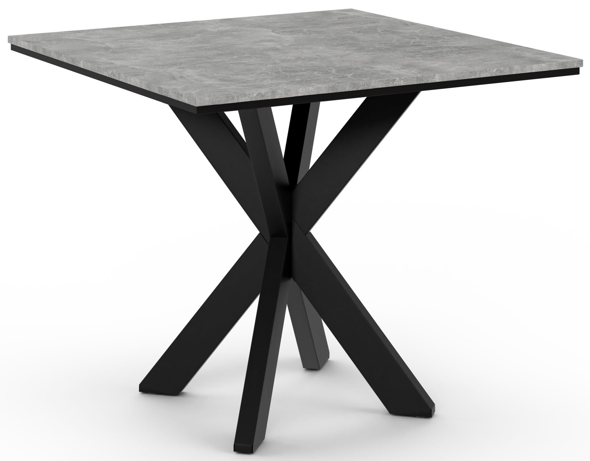 Kwadratowy stolik z blatem o teksturze przypominającej szary kamień lub beton. Blat ten posiada czarne krawędzie. Podstawa stolika jest wykonana z czarnego metalu i ma charakterystyczny, krzyżowy kształt nóg, które zbiegają się w centralnym punkcie pod blatem. Styl mebla jest nowoczesny i industrialny.