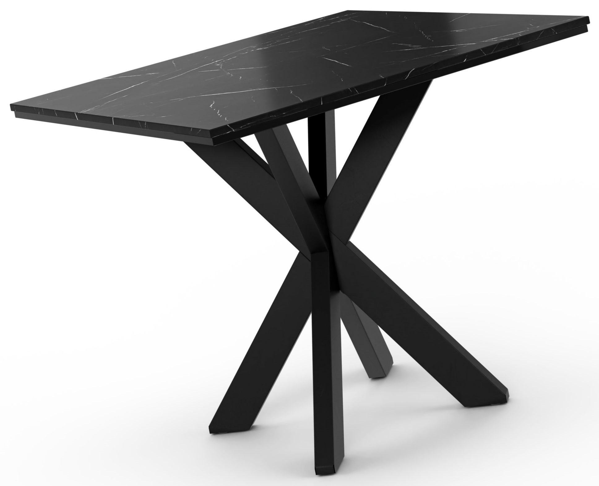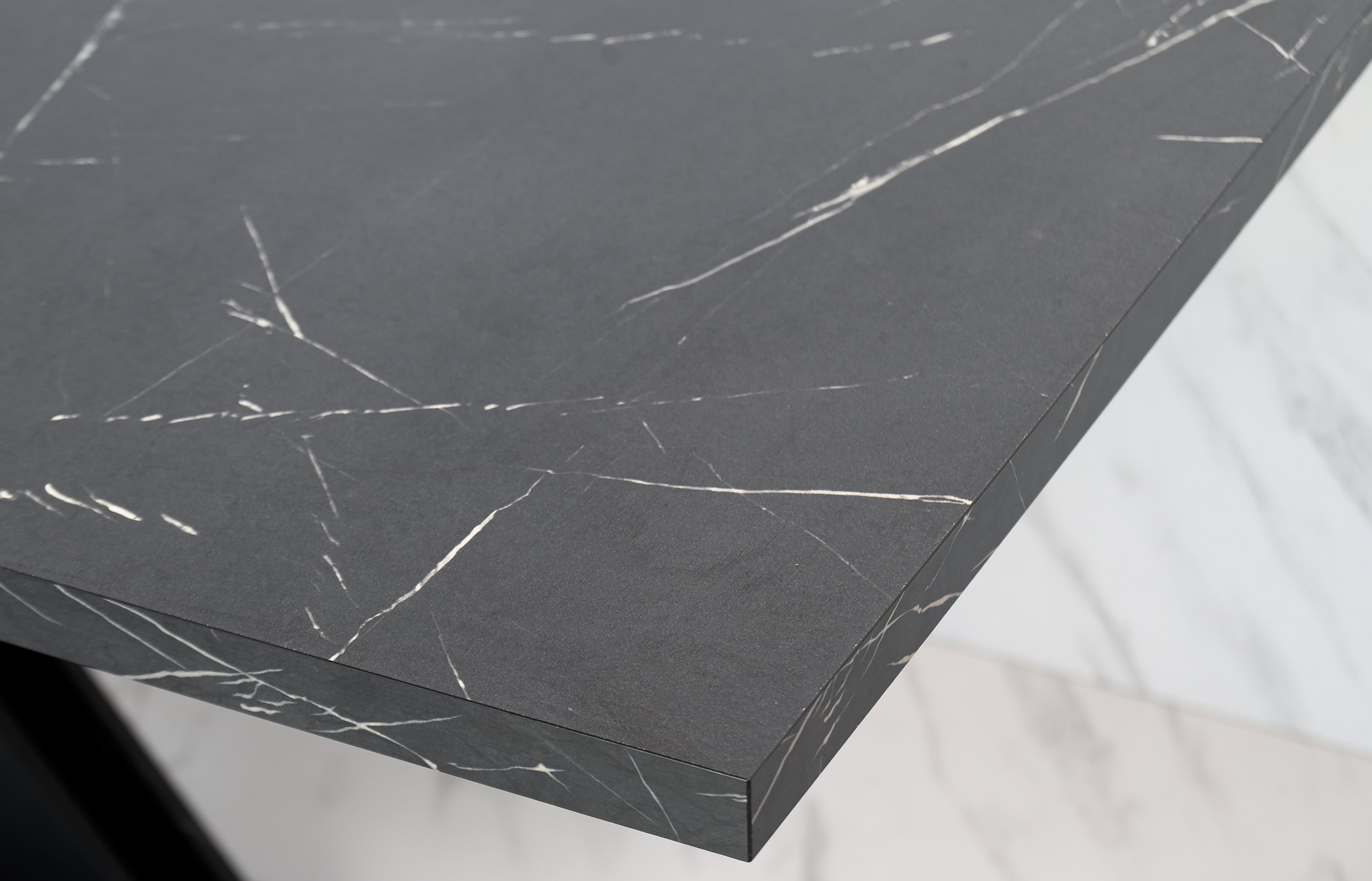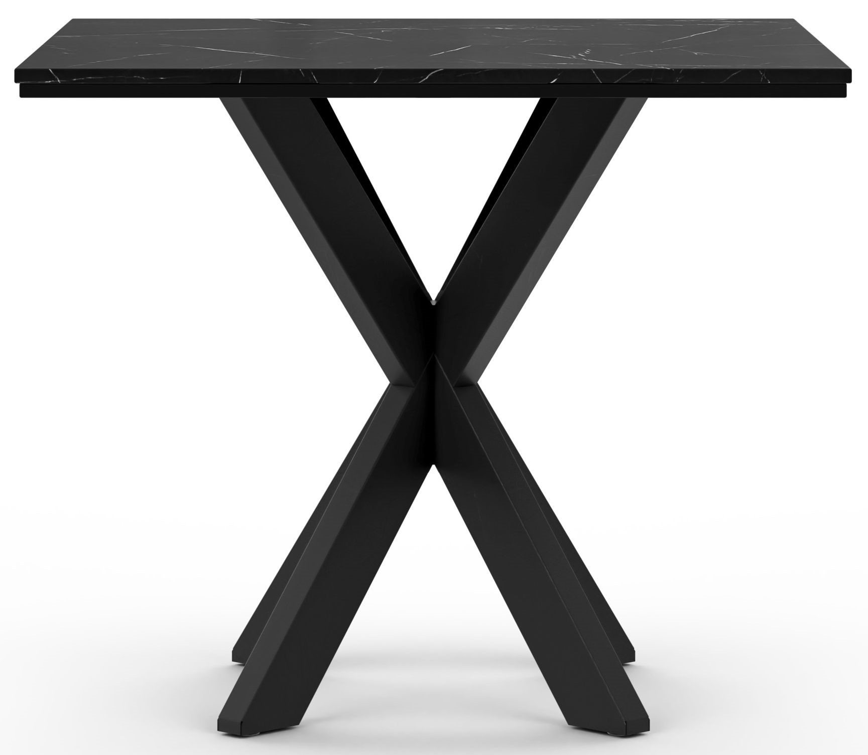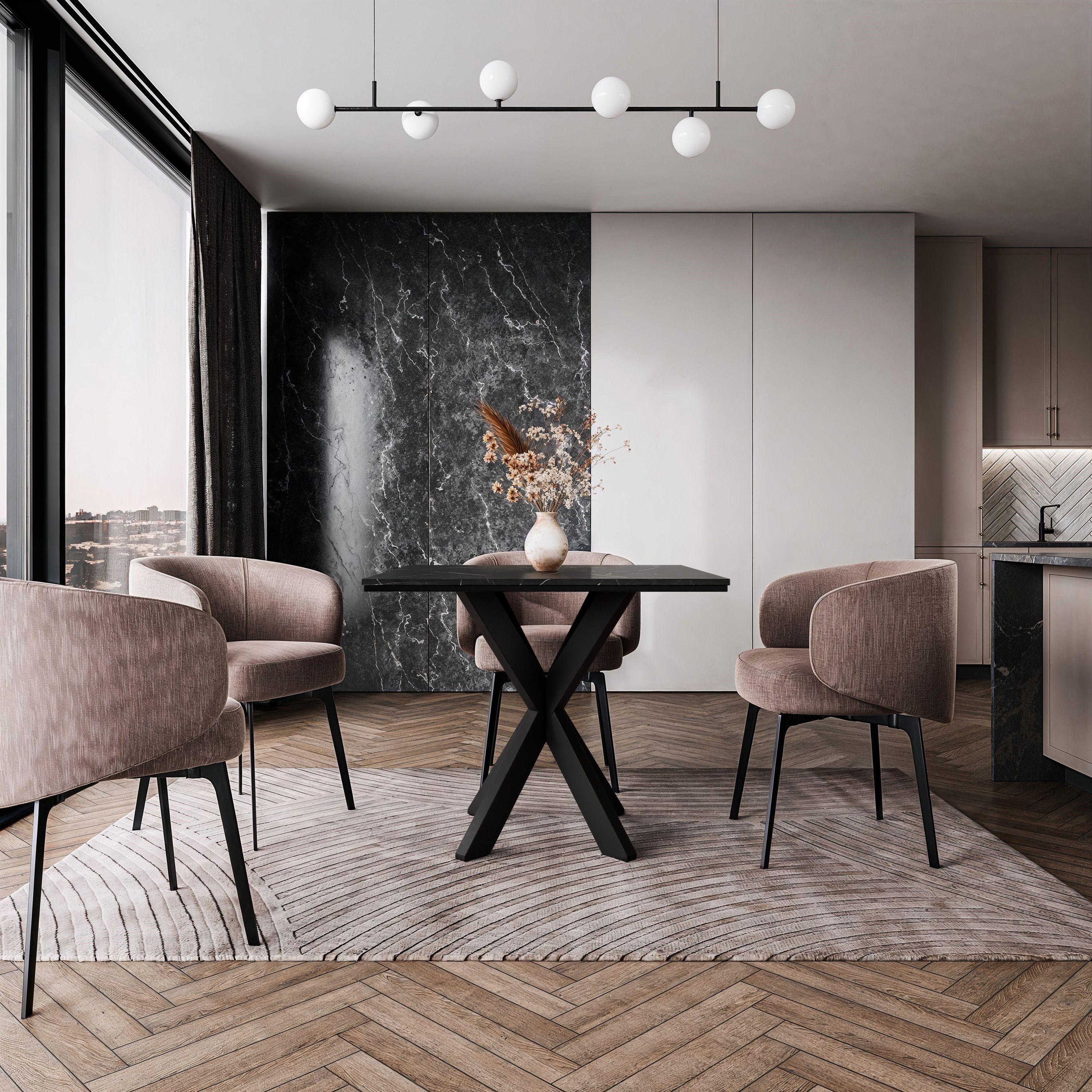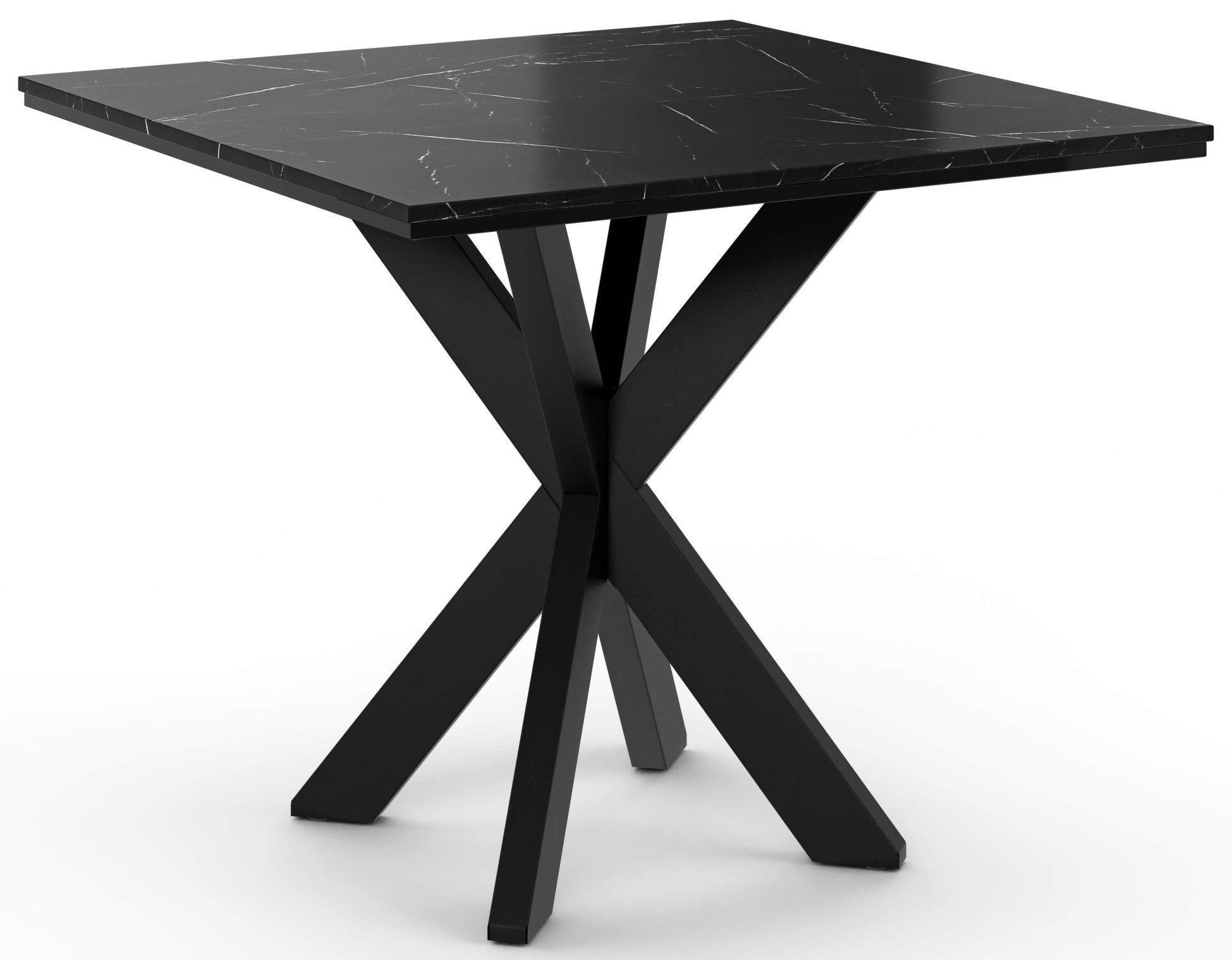 Nowoczesny, kwadratowy stół o eleganckim i wyrafinowanym wyglądzie. Blat w kolorze czarnym przypomina marmur — delikatne, białe żyłkowanie nadaje mu luksusowego charakteru i subtelnej głębi.
